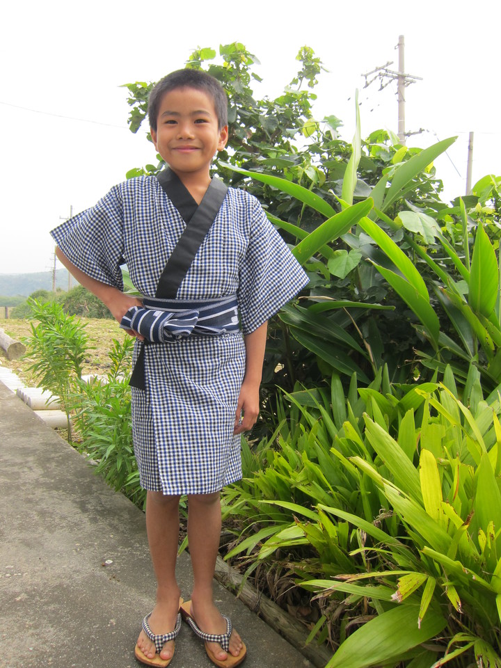 格子柄の中に、福木・車輪梅・藍などで染められた花が織りだされるのが特徴です。